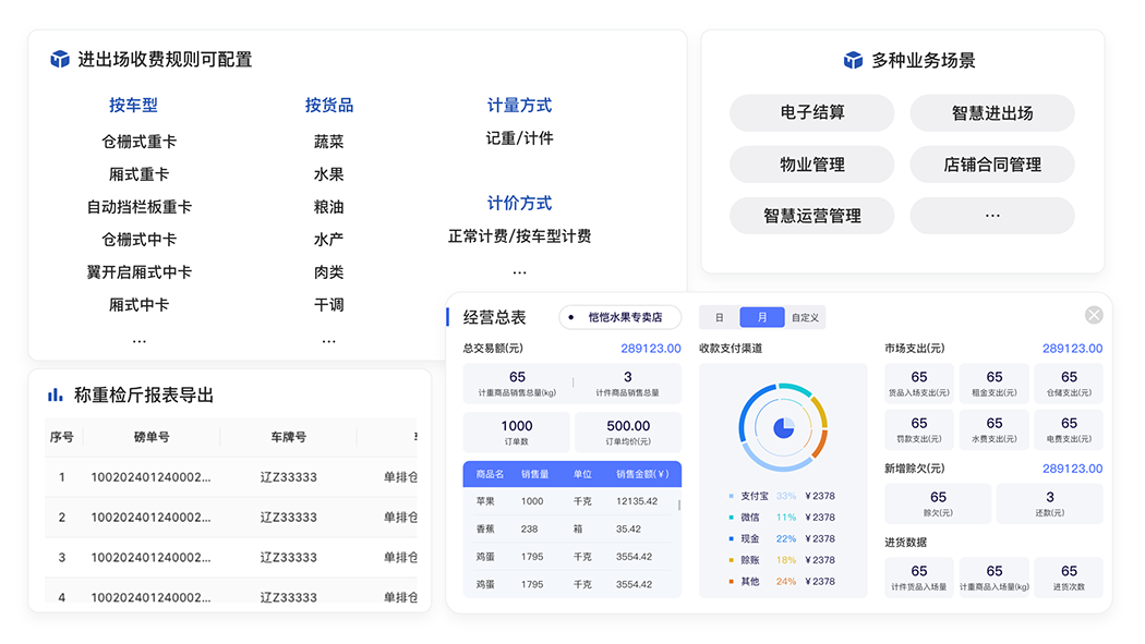 金馬衡器智慧農批系統是集成市場物業管理、電子結算、進出場管理等系統為一體的綜合解決方案,結合金馬衡器自研的電子臺秤、汽車衡器等智能物聯網設備,打造農產品批發市場運營服務新模式,助力現代農批市場數字化轉型升級,實現業務的可持續化增長